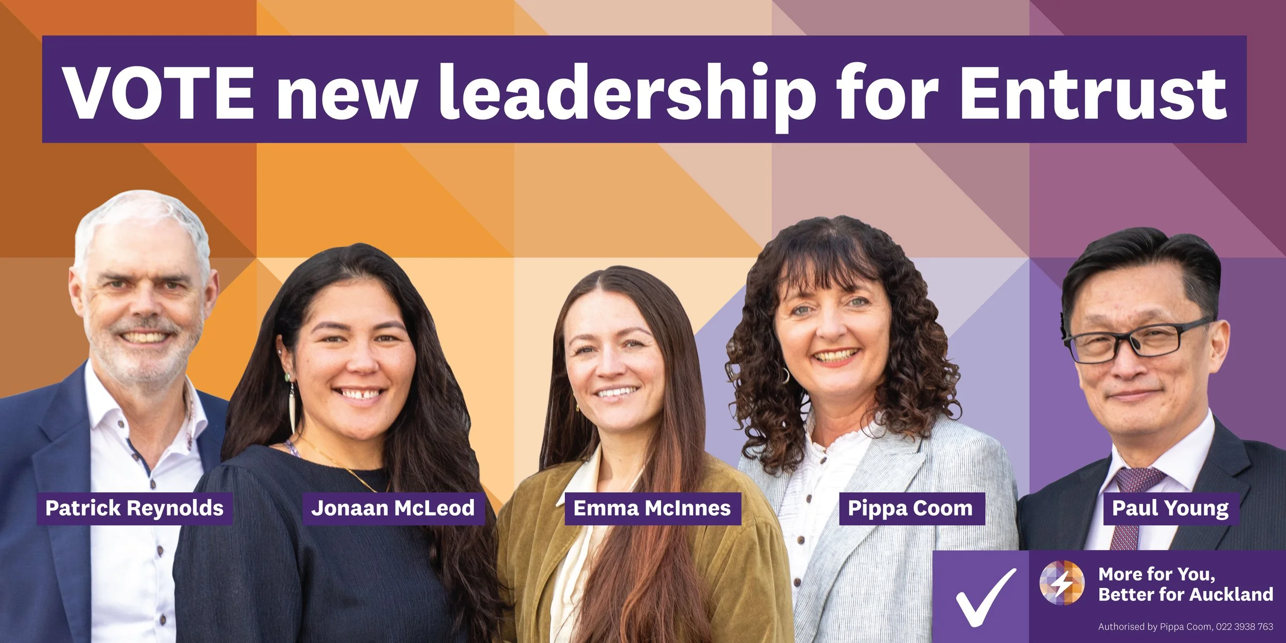這屆的「Entrust電力信託」選舉,請您在10月10日起陸續收到選票後,務必馬上勾選「More for you;Better for Auckland 為您爭取更多,讓奧克蘭更好」團隊的五名候選人,包括Coom、McInnes、McLeod、Reynolds和Young一起為您服務,選舉投票將在10月25日截止投票。